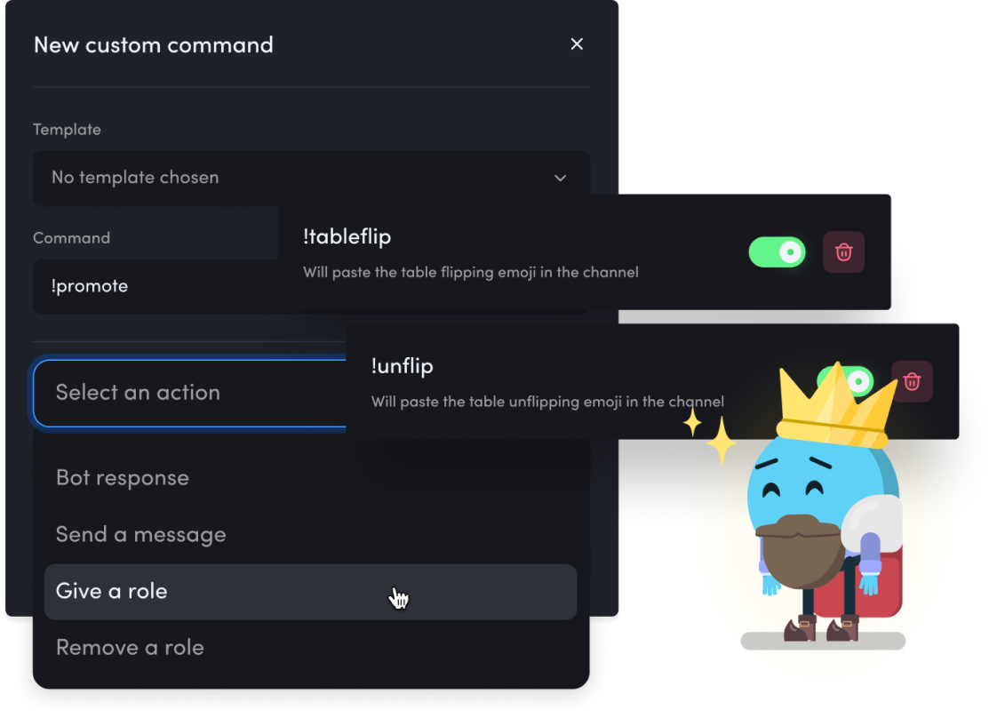 Empower your server with custom commands designed to automate tasks, streamline role management, and deliver predefined messages. With MEE6, you have the power to create personalized commands that align with your server's unique needs. Enhance user experience, save time, and unlock the full potential of your server by harnessing the customizable command system offered by MEE6. It’s the best way to personalize your Discord.If you get a bit lost in all of the command possibilities, don’t forget to message support and check out our tutorial. Powerful bots like MEE6 can be overwhelming at first!